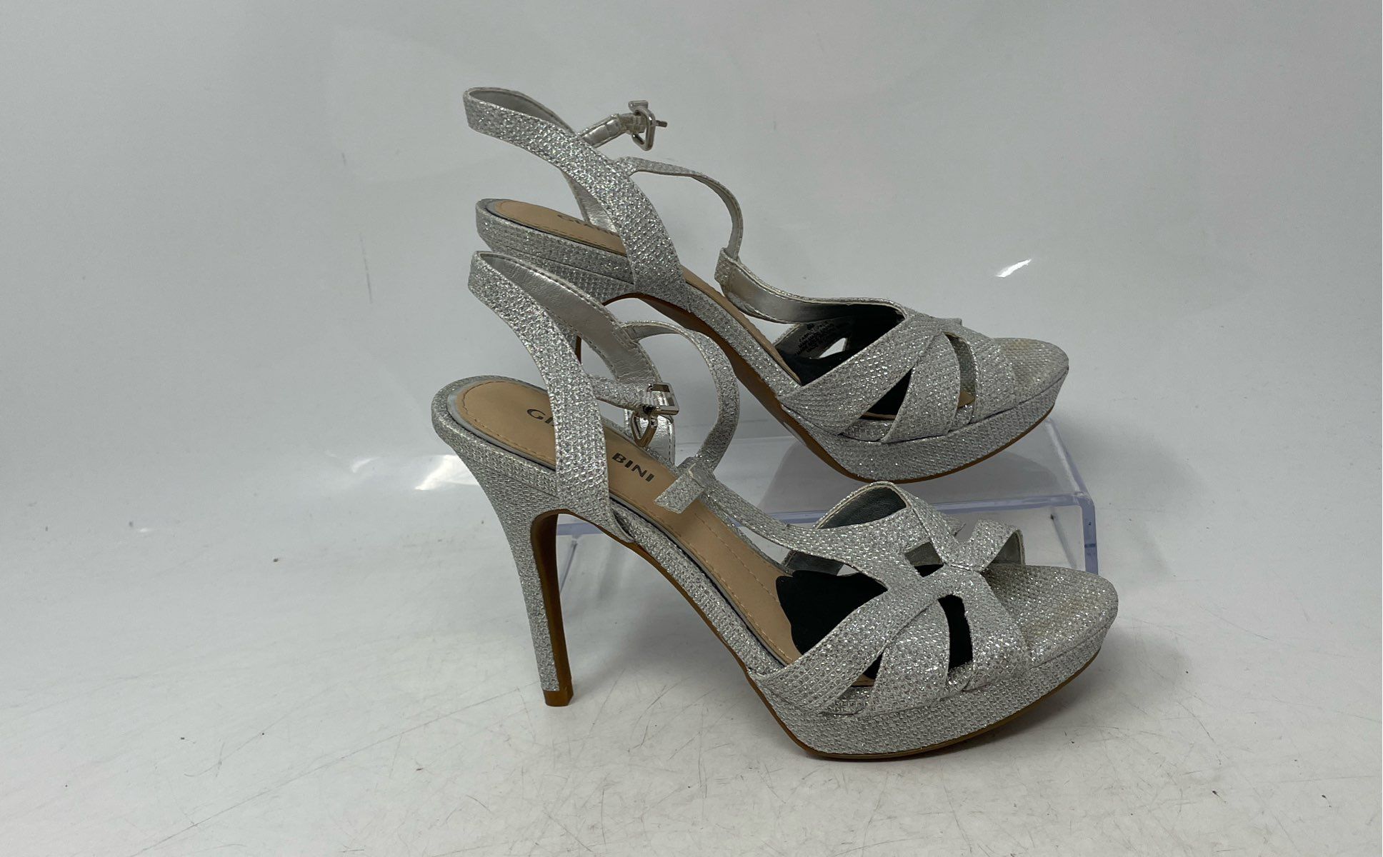 • Description: Gianni Bini Womens Silver Tone Glitter Ankle Strap Sandals Size 6M Minor Stain