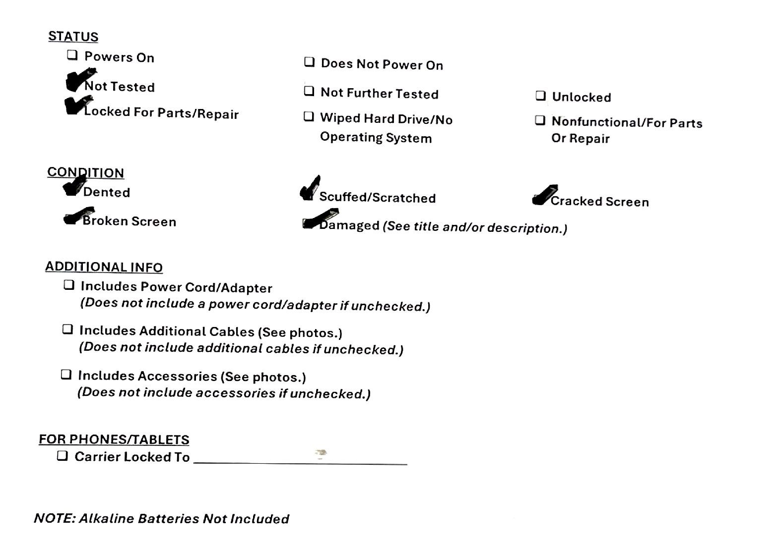 • Condition: Dented, Scuffed/Scratched, Cracked Screen, Broken Screen, Damaged, Pre-owned
