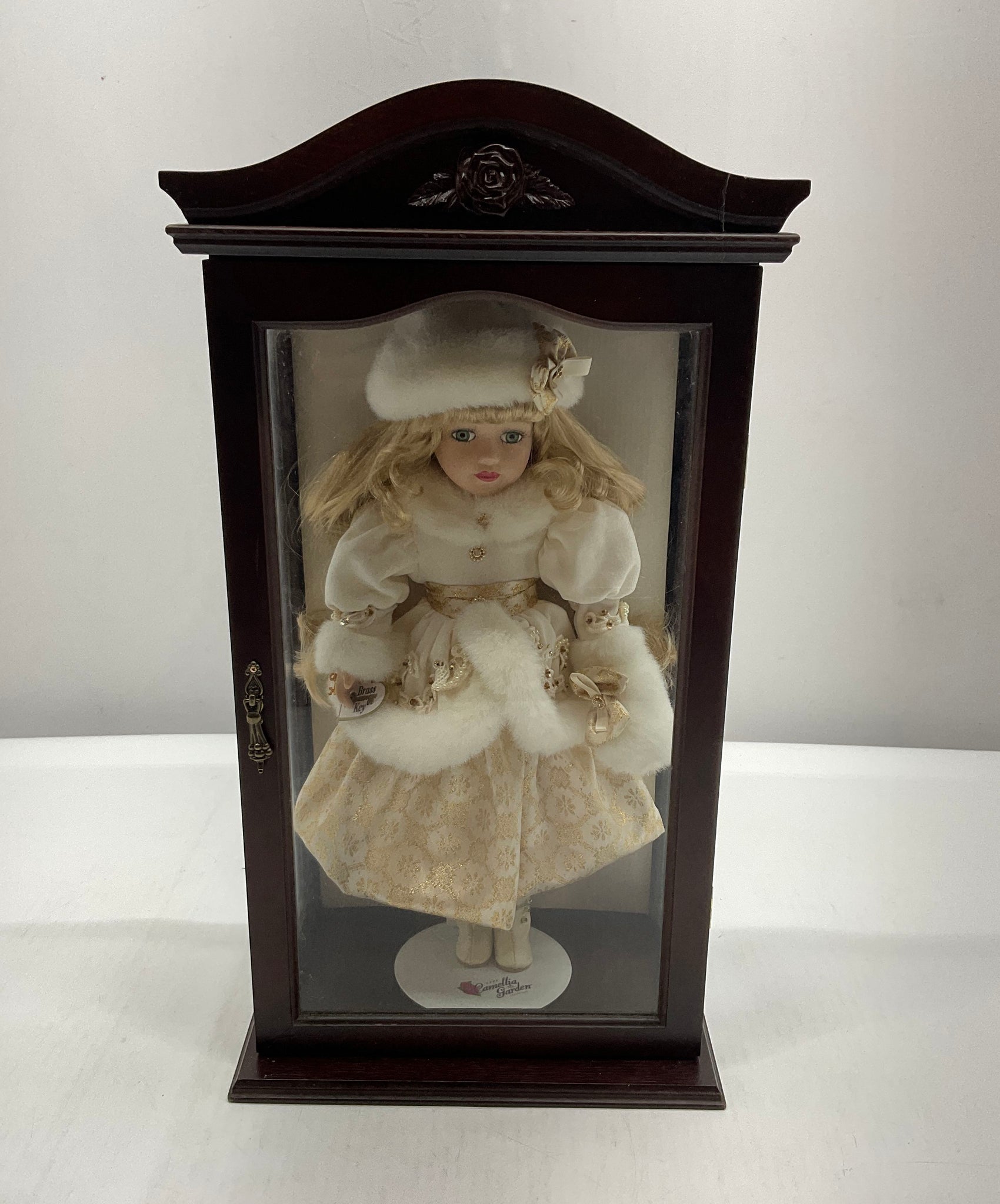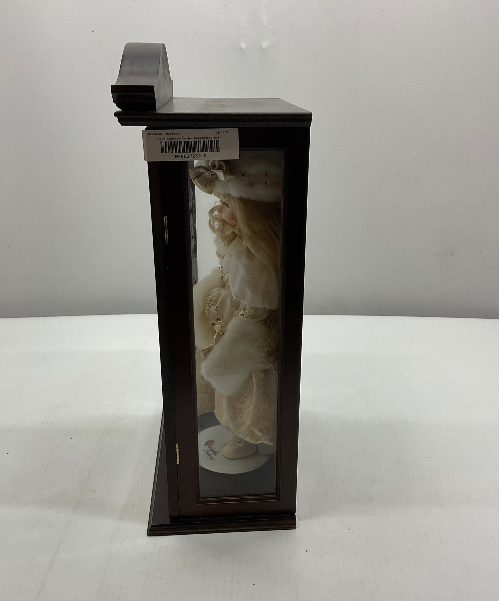 - Description: 1999 Camellia Garden Collection Floral Dress Porcelain Doll On Wooden Display