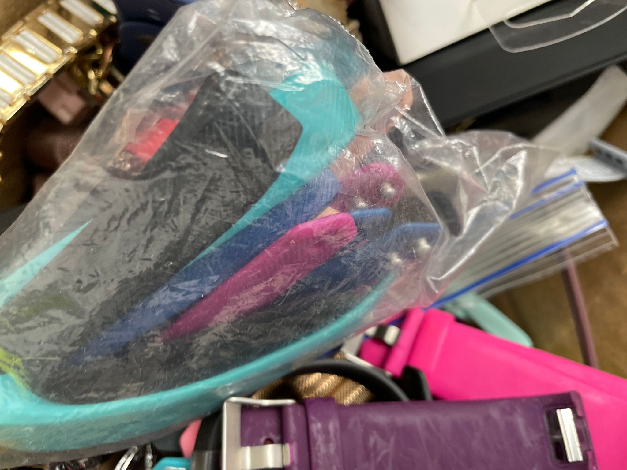 Description: _8_ pounds and _13.7_ ounces of assorted miscellaneous items. This miscellaneous lot may include, but is not limited to, hair accessories, purse hangers, key chains, waist chains, watch parts, compact mirrors, coin purses, votive, temporary tattoos, napkin rings, loose beads, craft string, and other assortments of jewelry making accessories. There may be varying materials including but not limited to silver tone or plated, glass, copper, gold tone or plated, titanium, copper wire, wood, stainless steel, spandex, elastic, mixed metals, plastic, and rhinestones. Please consider the photographs as a part of the description.