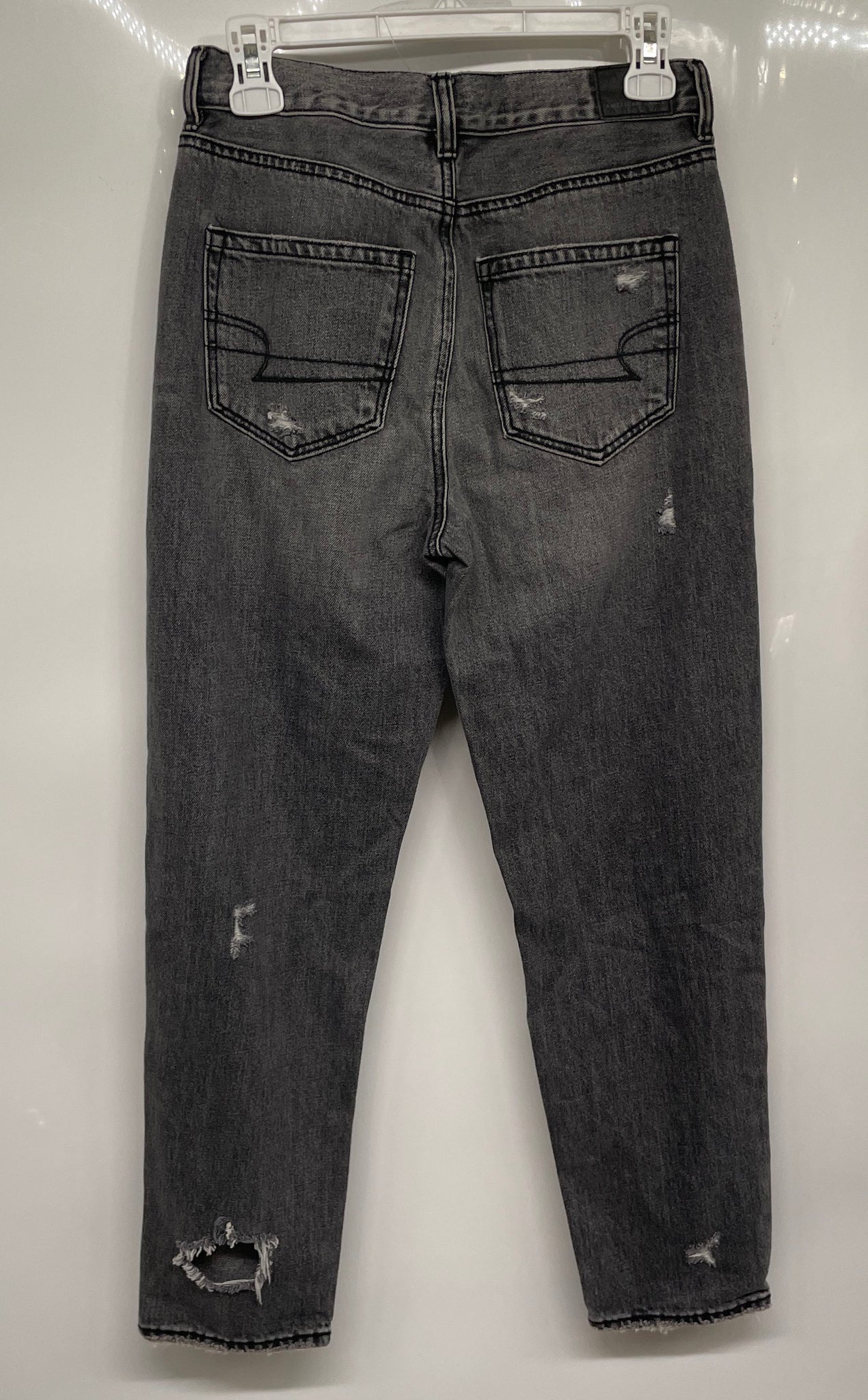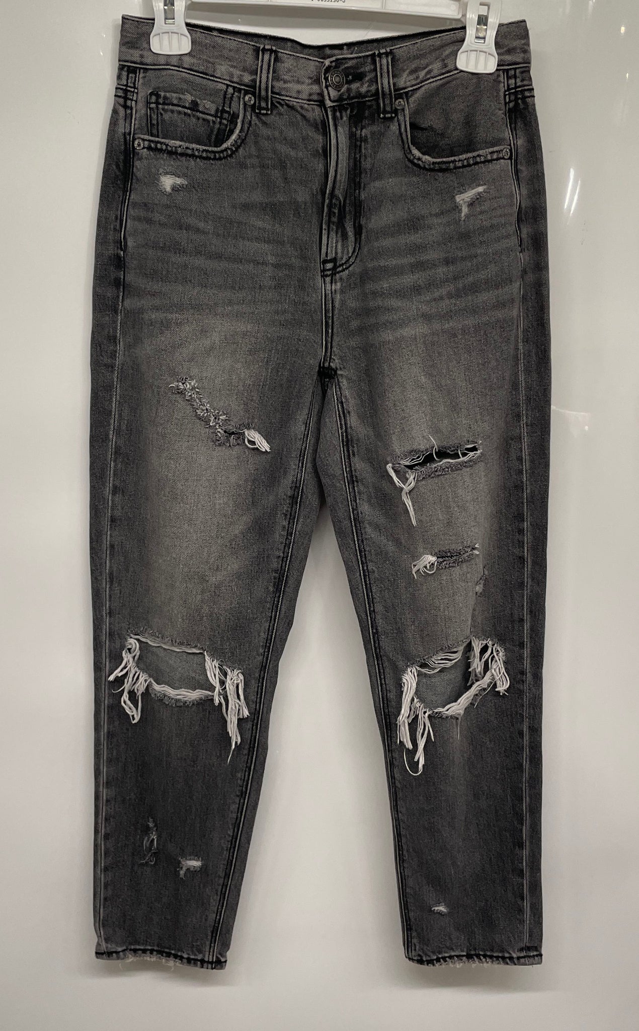 - Description: American Eagle Womens Black Cotton Denim High-Rise Distressed Mom Jeans Size 2