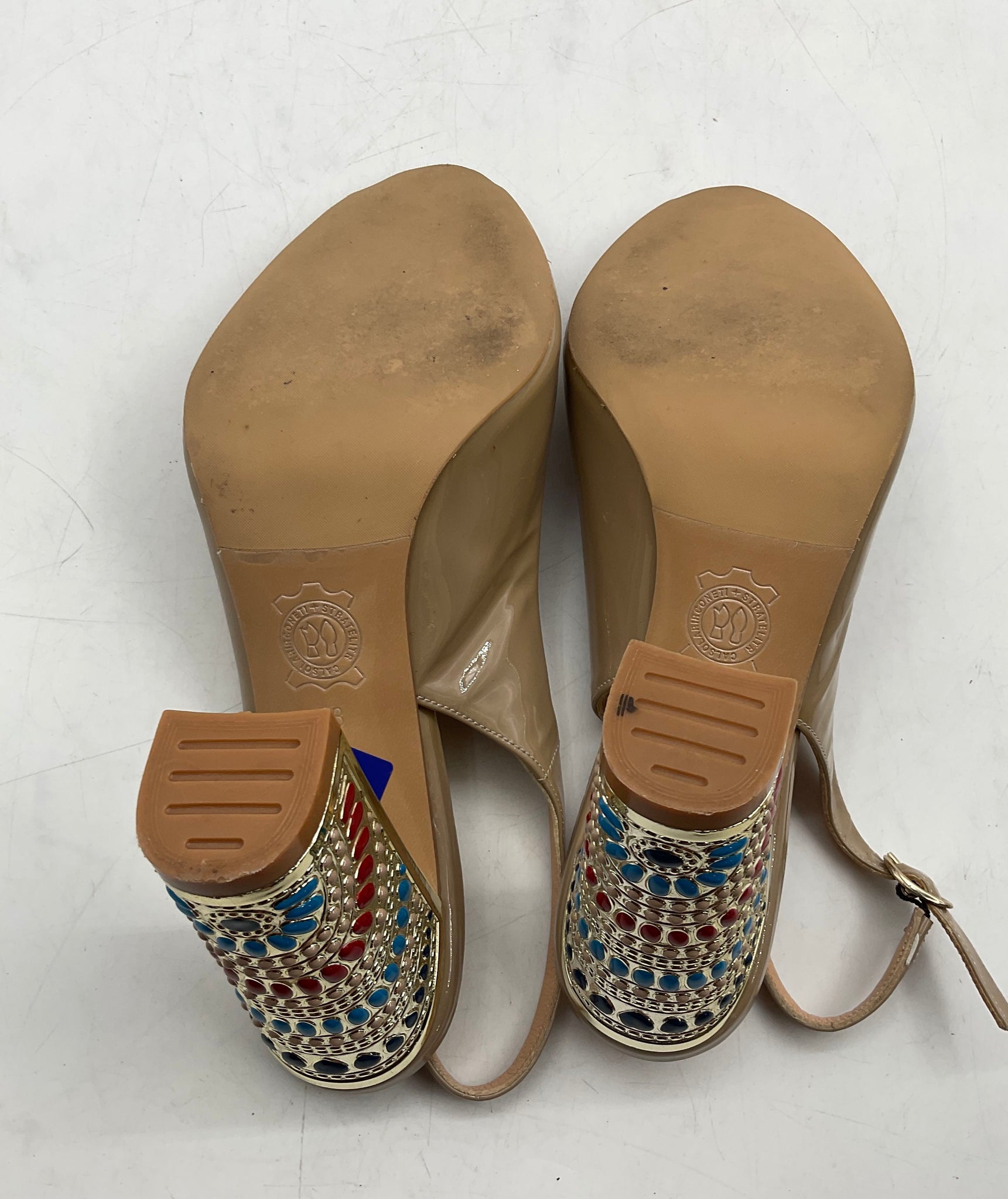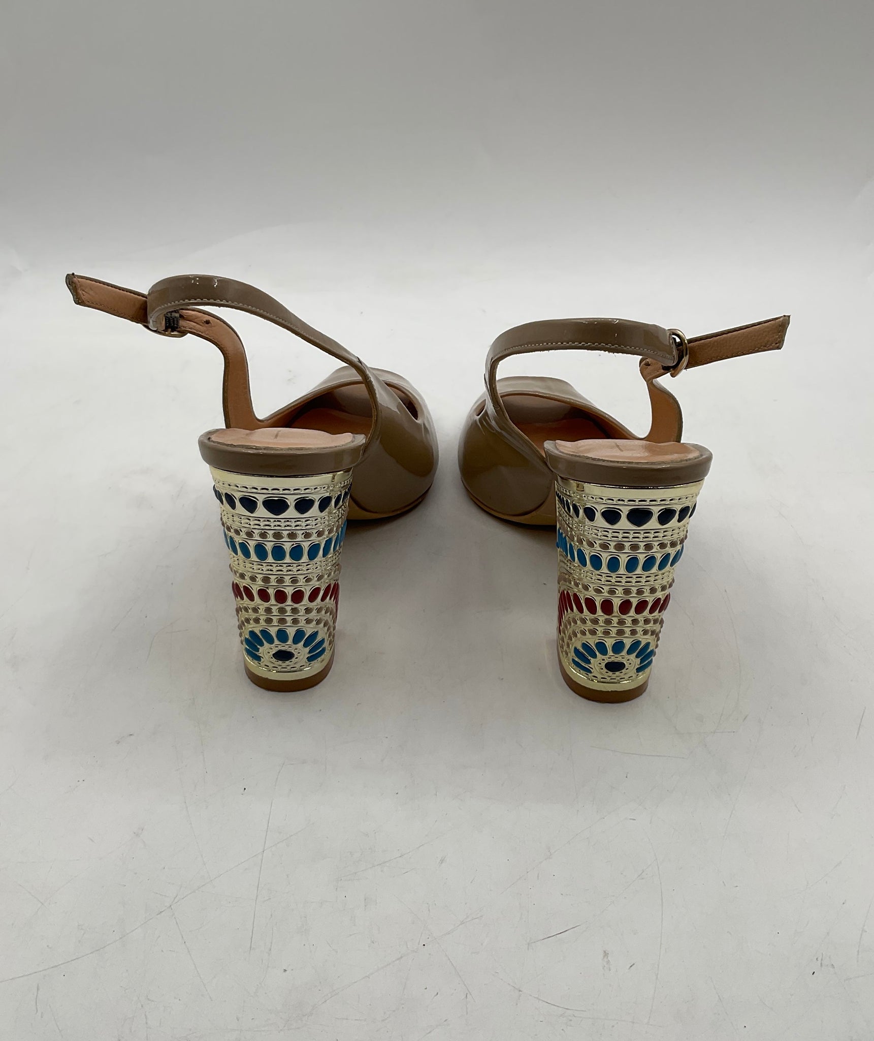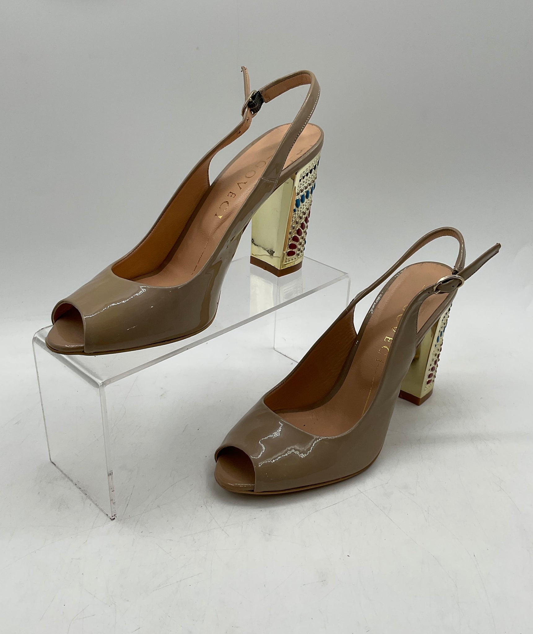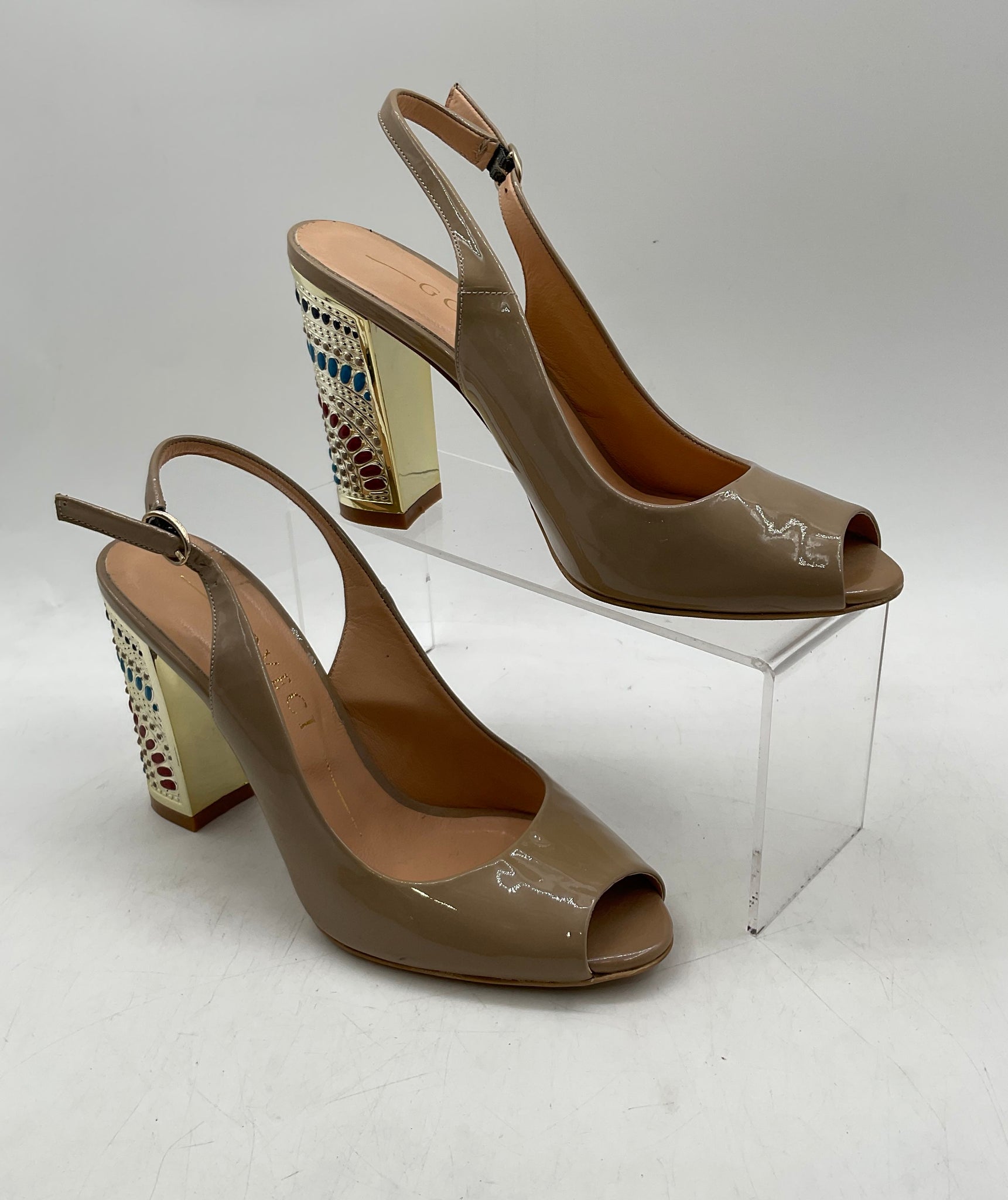 - Description: Goveci Womens Beige Peep Toe Adjustable Strap Block Slingback Heels Size EUR 38