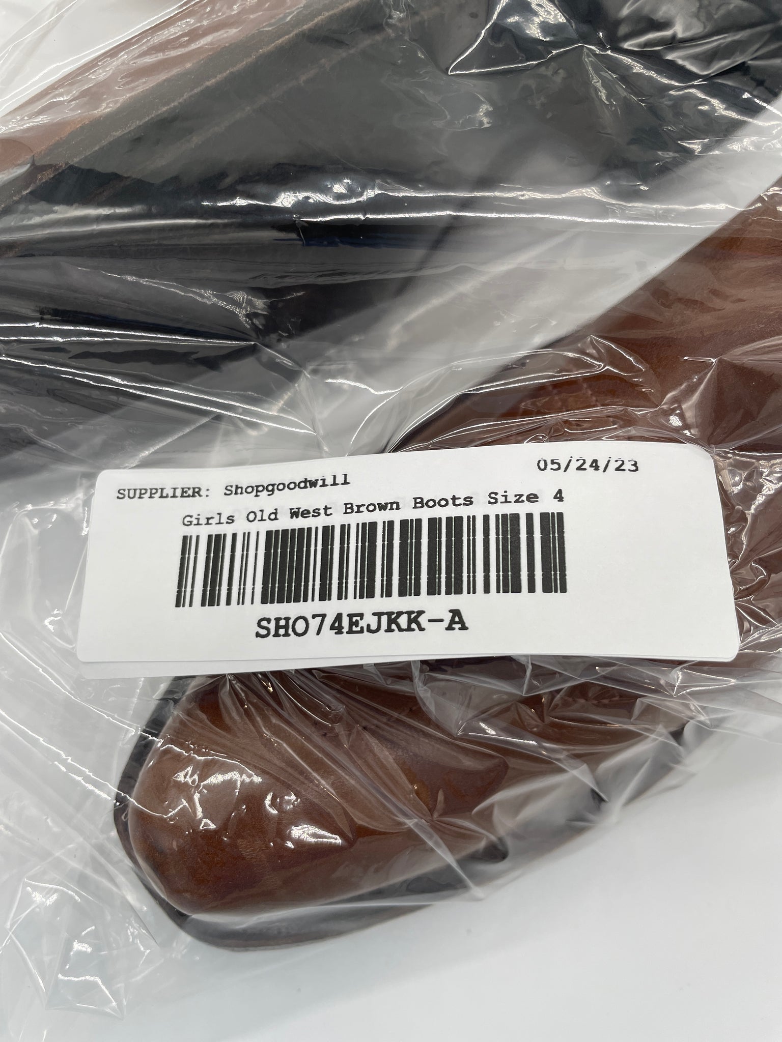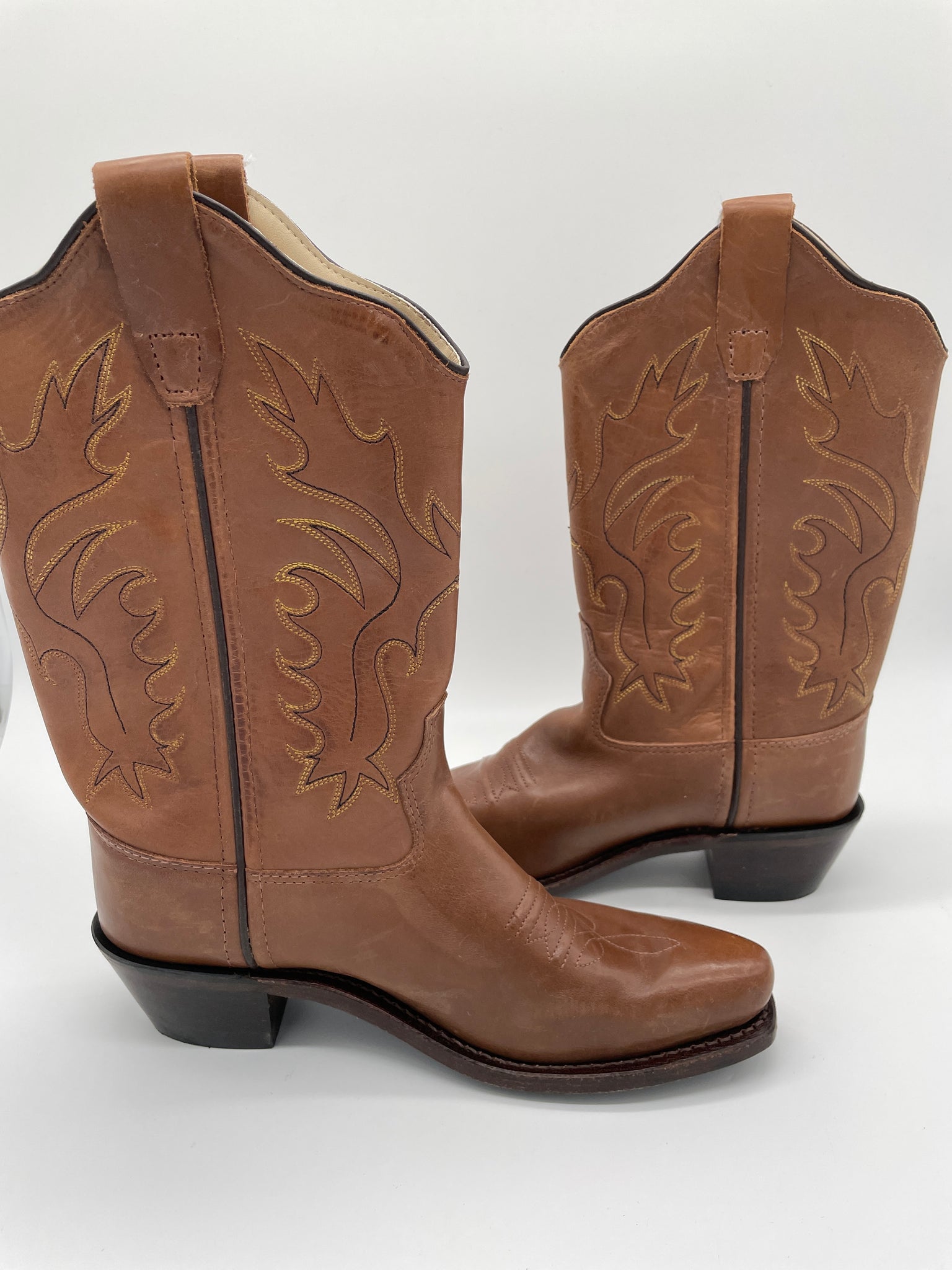 - Description: Old West Girls Brown Leather Pull On Snip Toe Mid Calf Western Boots Size 4